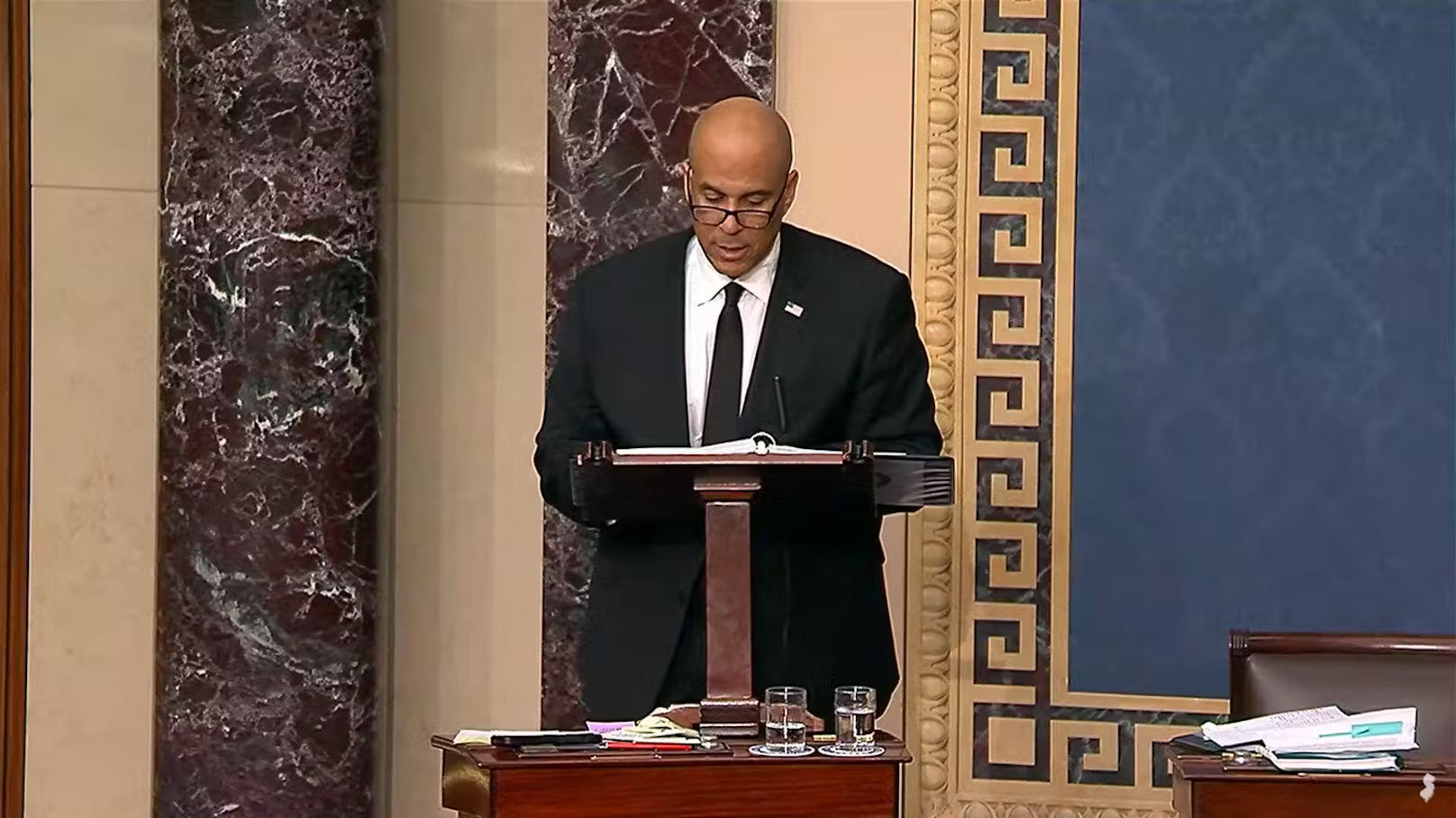 Booker began his speech at roughly 7:00 p.m. ET Monday and refused to yield the floor until he physically could no longer continue. In doing so, the 55-year-old former Newark mayor demonstrated remarkable stamina and discipline. He stood the entire time, never leaving the small space by the podium. He did not eat, subsisting only on occasional sips from two glasses of water that aides refilled as needed. At times, he leaned on the podium for support or mopped his brow with a handkerchief, but he notably never loosened his suit and tie even as the hours wore on. Senate rules required him to stay on his feet and keep speaking "more or less continuously" throughout – he could not sit or depart without forfeiting the floor. In a savvy move to avoid any lapse, Booker even had a page remove his chair from the chamber to eliminate any temptation to sit down, according to Sen. Chris Murphy. Each time a Democratic colleague rose to help by interjecting a lengthy question – the only permissible respite – Booker dutifully recited the ritual phrase "I will yield for a question while retaining the floor," ensuring he never accidentally gave up his marathon effort. He remained upright beside his desk even as others spoke, catching brief moments of relief but never leaving the spotlight.